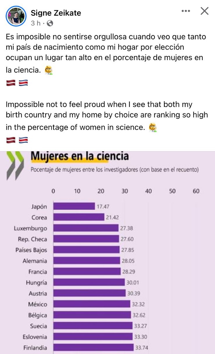«Es imposible no sentirse orgullosa cuando veo que tanto mi país de nacimiento como mi hogar por elección ocupan un lugar tan alto en el porcentaje de mujeres en la ciencia,» escribió.