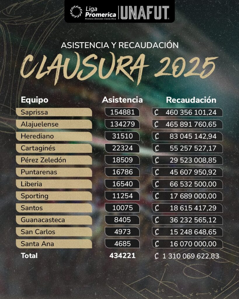 La UNAFUT dio a conocer este martes 01 de julio la recaudación de los 12 equipos y también la asistencia que tuvo cada uno durante el torneo de Clausura 2025. Alajuelense fue el que recaudó más dinero y Saprissa el equipo que llevó más aficionados al estadio: