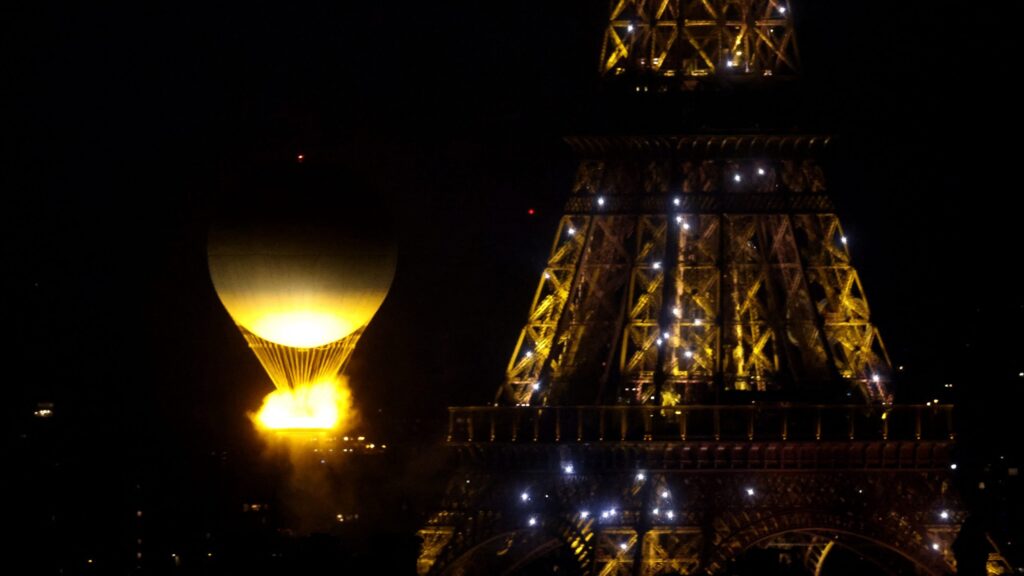 El fuego olímpico iluminó el cielo de París elevado en un globo aerostático que sostendrá el pebetero durante los Juegos