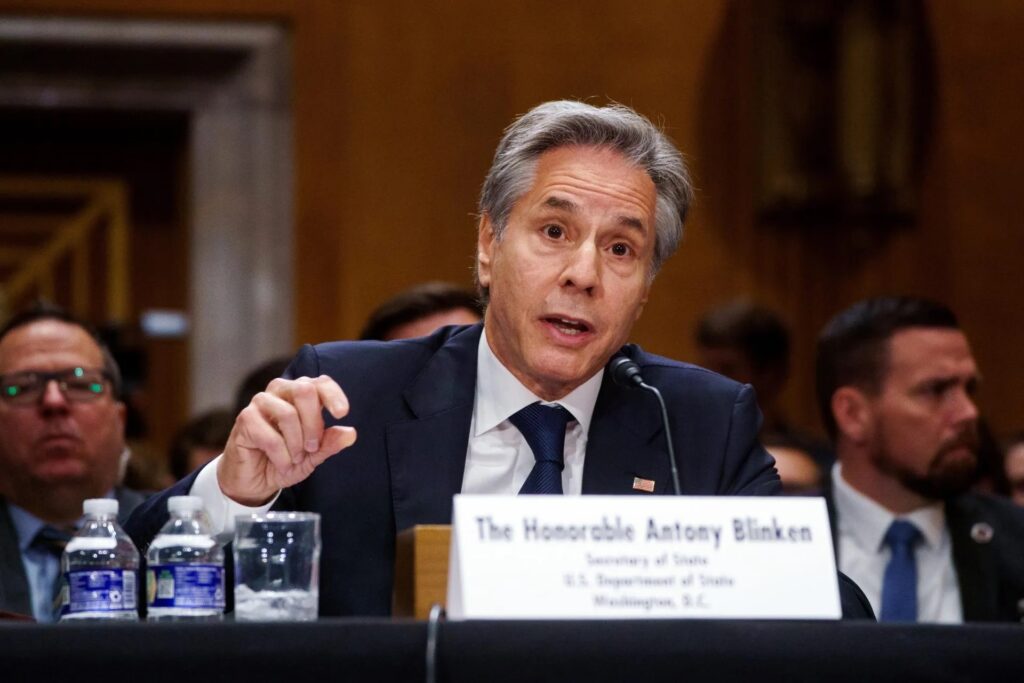 Durante la audiencia en un salón del Senado, el jefe de la diplomacia estadounidense fue interrumpido varias veces por activistas.
