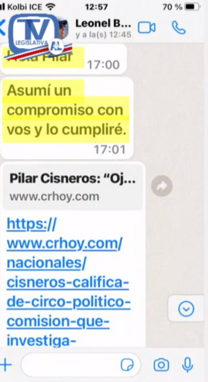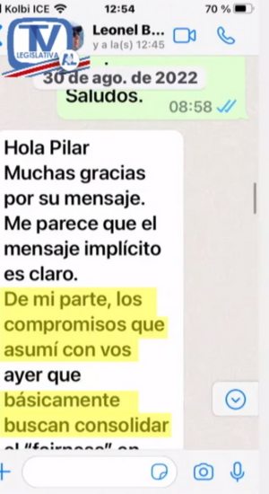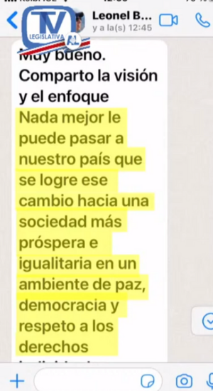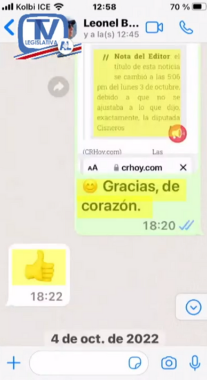 Finalmente, la diputada oficialista agregó que los mensajes mostrados revelan que la conversación que ambos mantuvieron en el mes de agosto en su oficina fueron cordiales, por lo cual, no es cierto lo señalado por el presidente del Banco BCT.