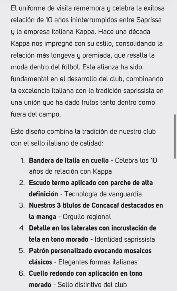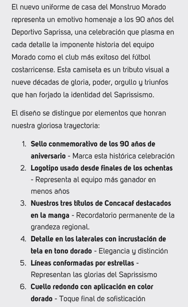 “Los diseños rinden homenaje a la vasta historia del club más ganador del fútbol costarricense en sus 90 años de historia y, también celebran una década de exitosa alianza con la reconocida marca italiana Kappa”, publicó Saprissa en un comunicado de prensa que sigue así: